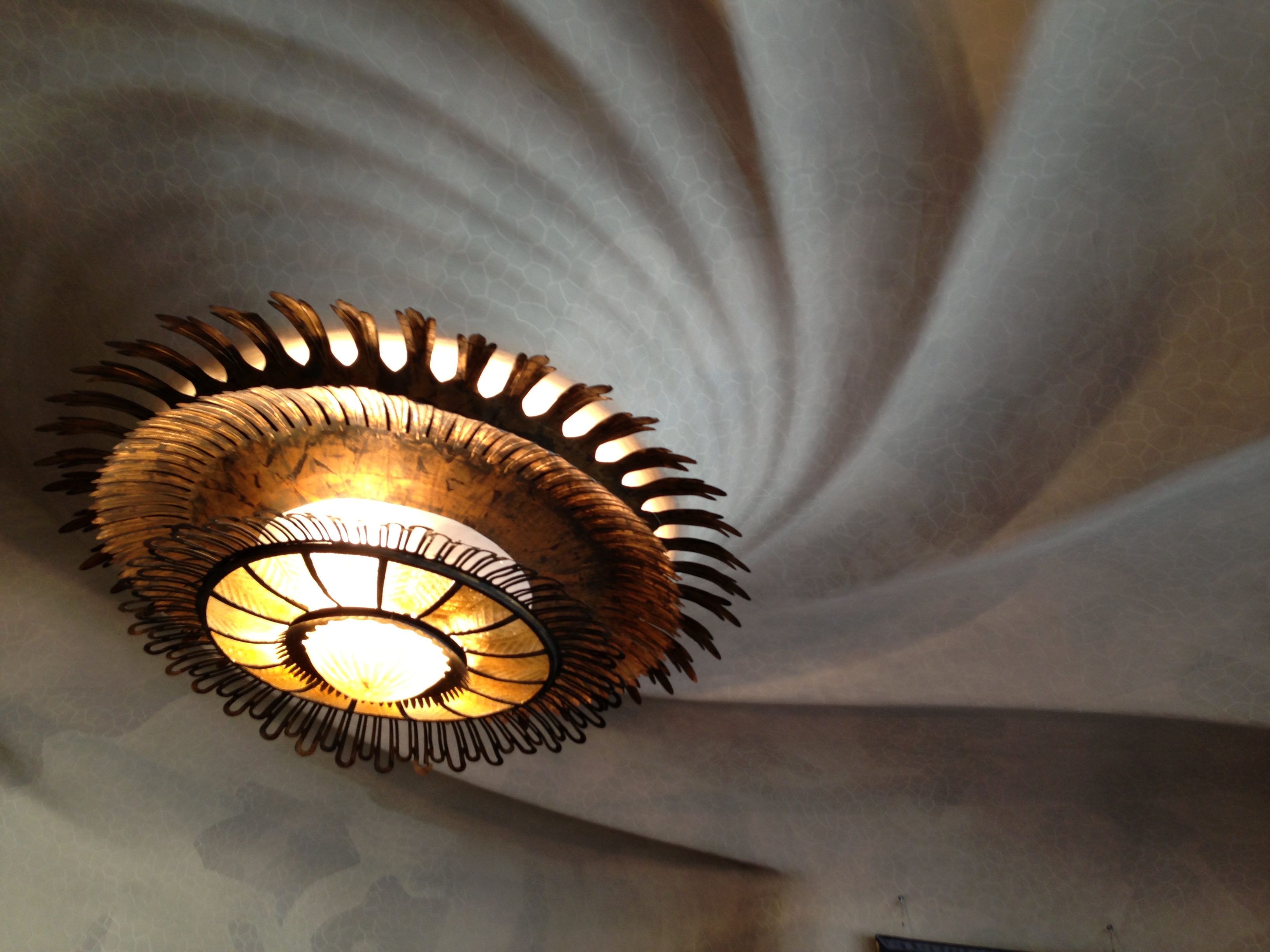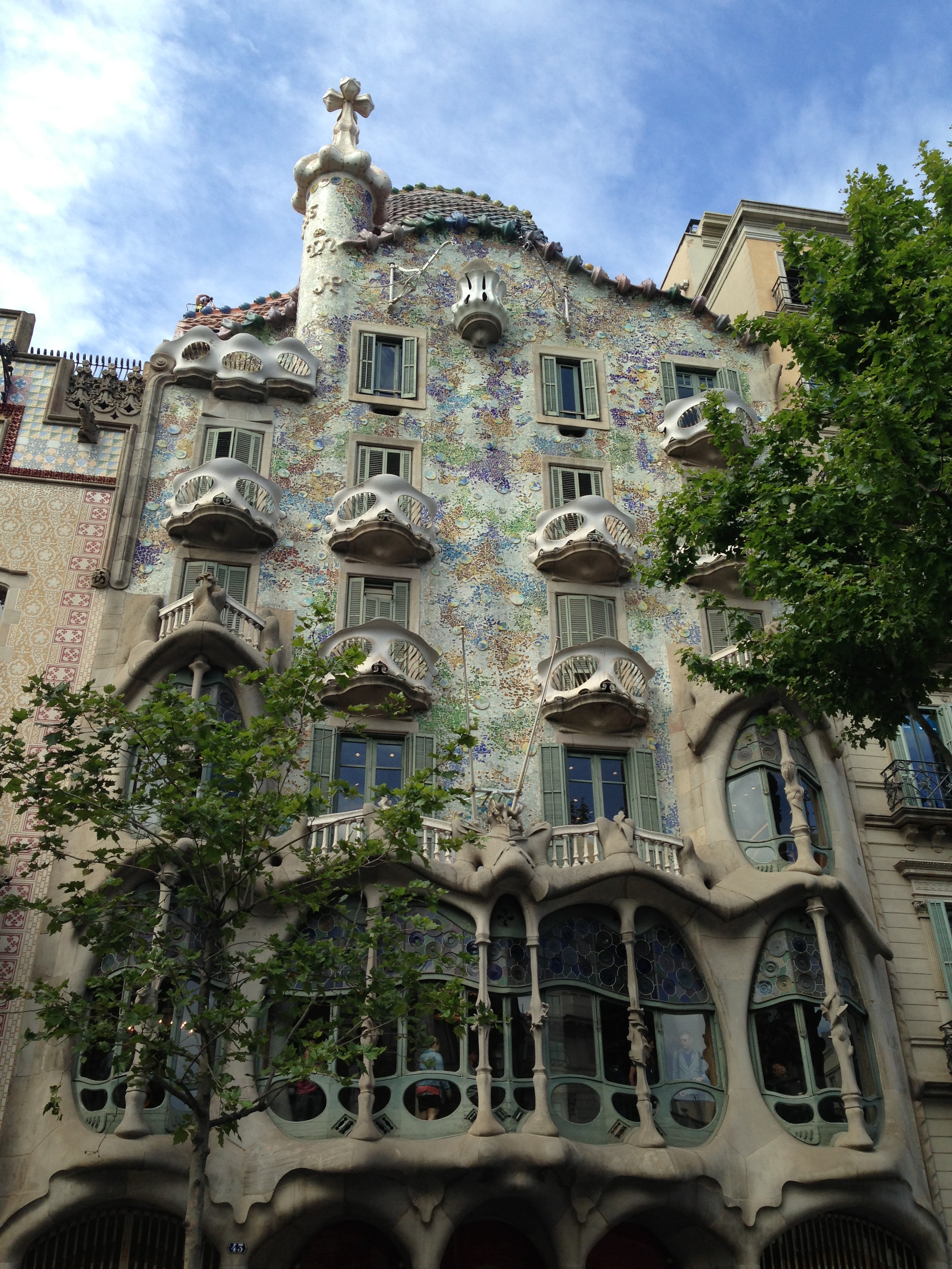 Casa Batlló is sometimes called the “House of Bones” because of its facade, which has skeletal pillars and balconies. The green and blue tiles that cover the facade also give it an underwater feel that continues throughout the house (it’s astounding how many times the audio guide used the word “undulating” in reference to one of Casa Batlló’s design elements).