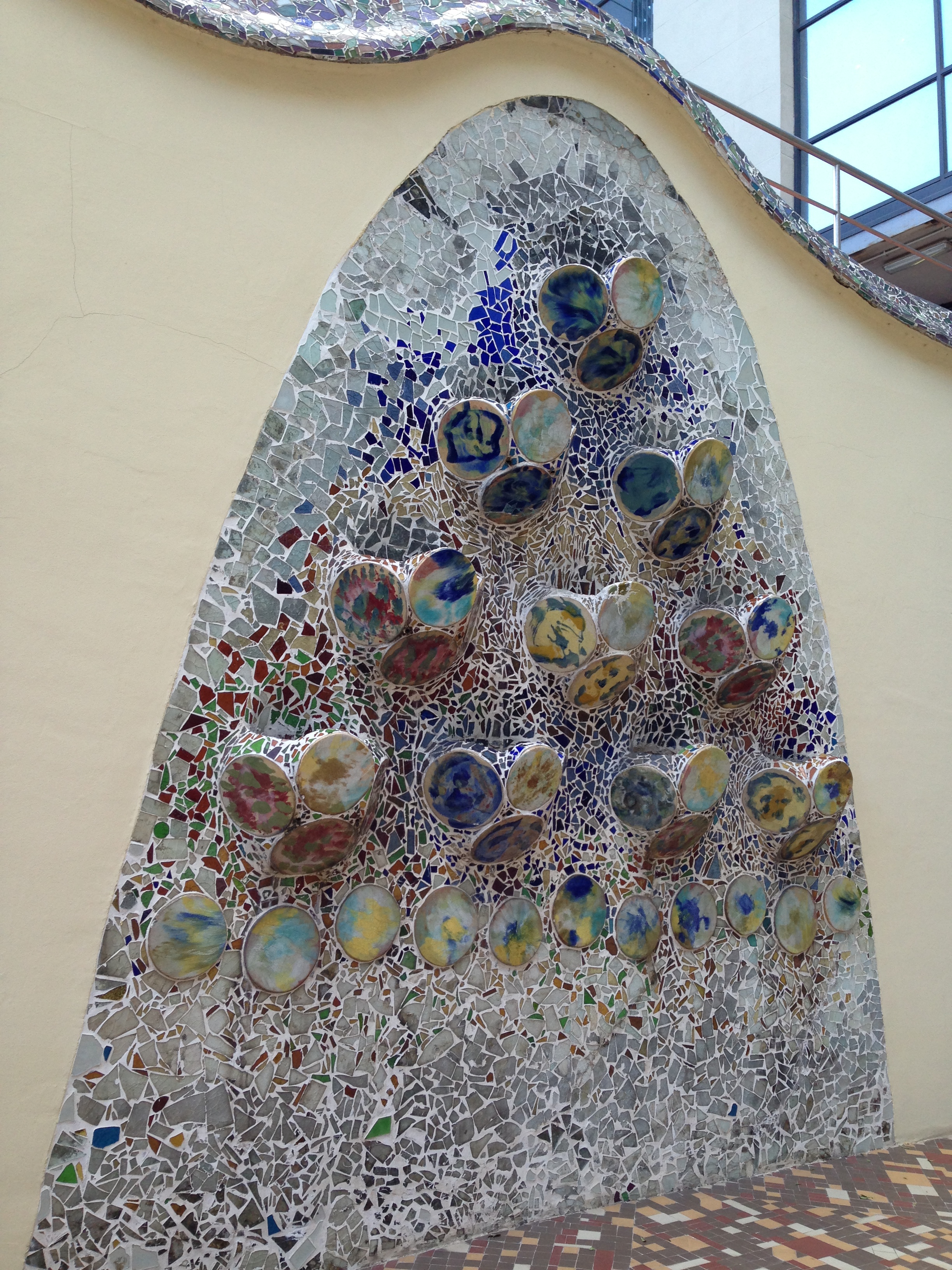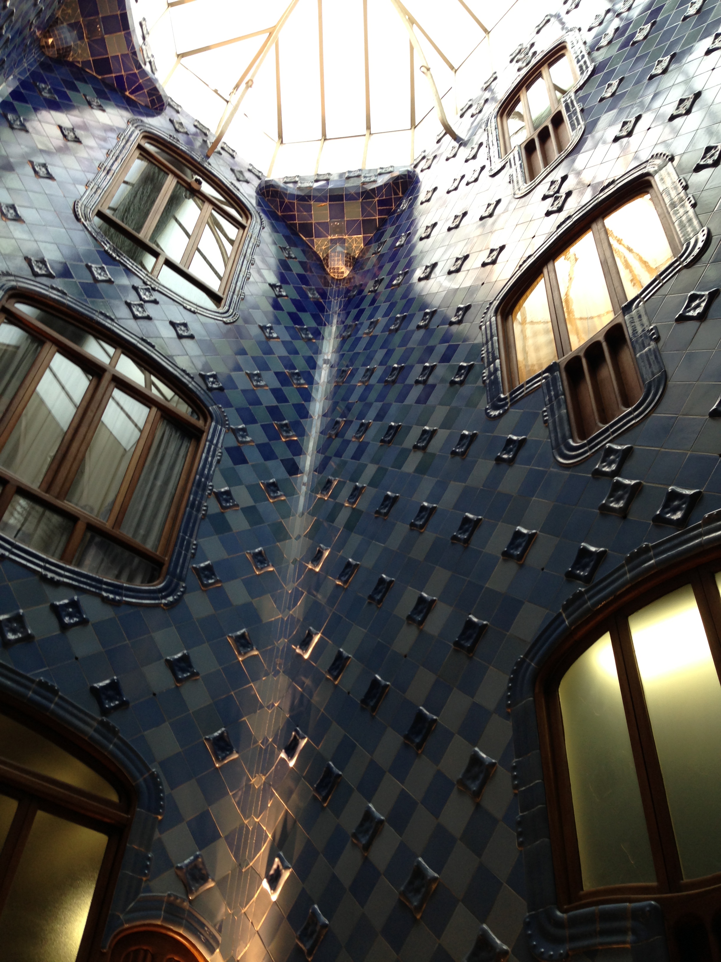 As we already learned from the stained glass in the Sagrada Familia, Gaudí loves to emphasize light, especially thoughtful use of natural light. In the Casa Batlló, he used an equalization technique in the interior courtyards to ensure that each floor received the same amount of sunlight. The lowest floors have have light blue tiles and large windows, while the tiles near the top floors are dark and the windows are smaller.
