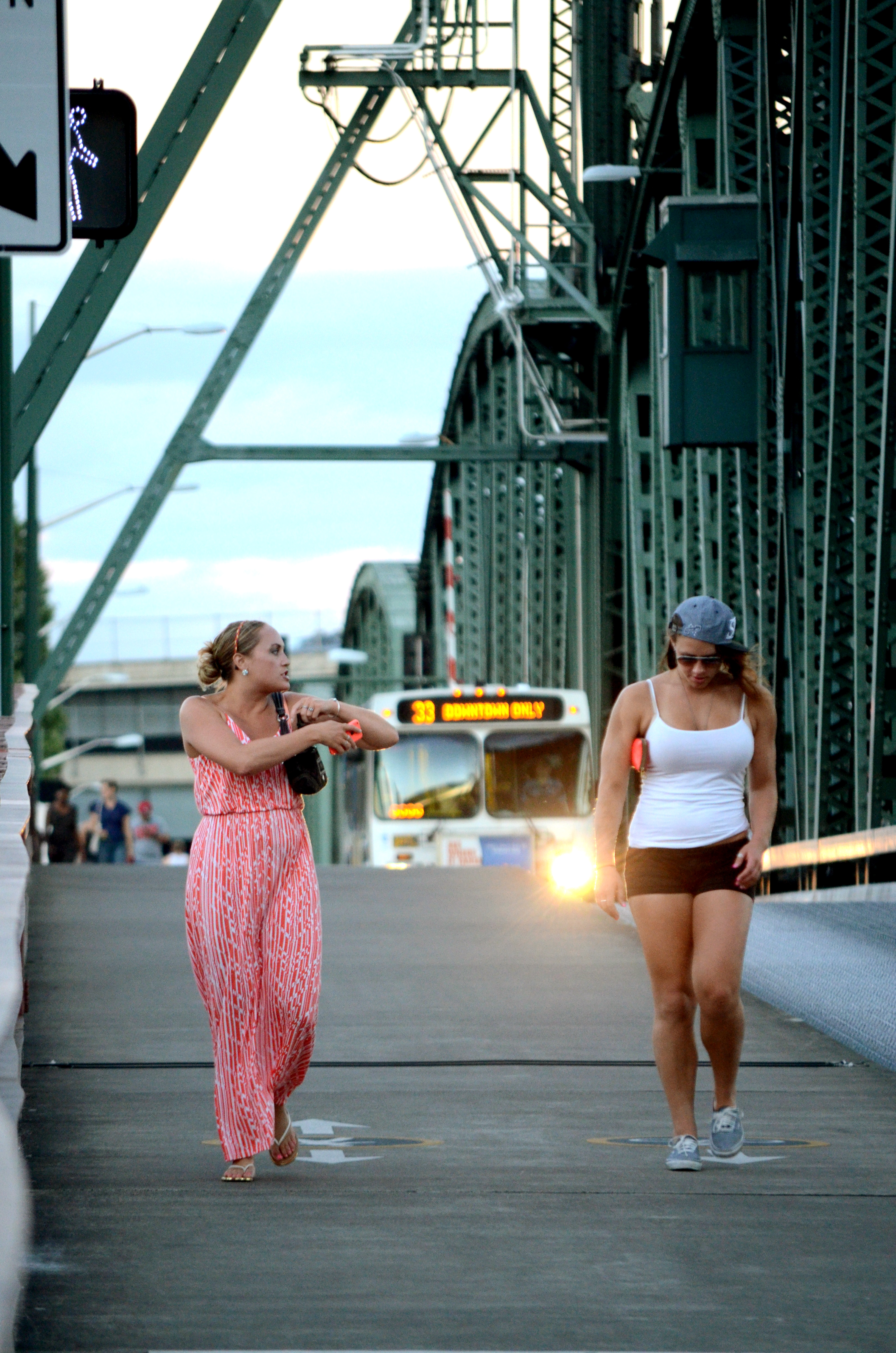 There’s a lot going on in this photo, and I like it more the longer I look at it. The women almost seem to be floating…and there’s the walk sign just on the side. The one on the right wears your shoes, and the bridge…well, we do live in Bridgetown. And public transport. You’ve captured a lot of Portland!