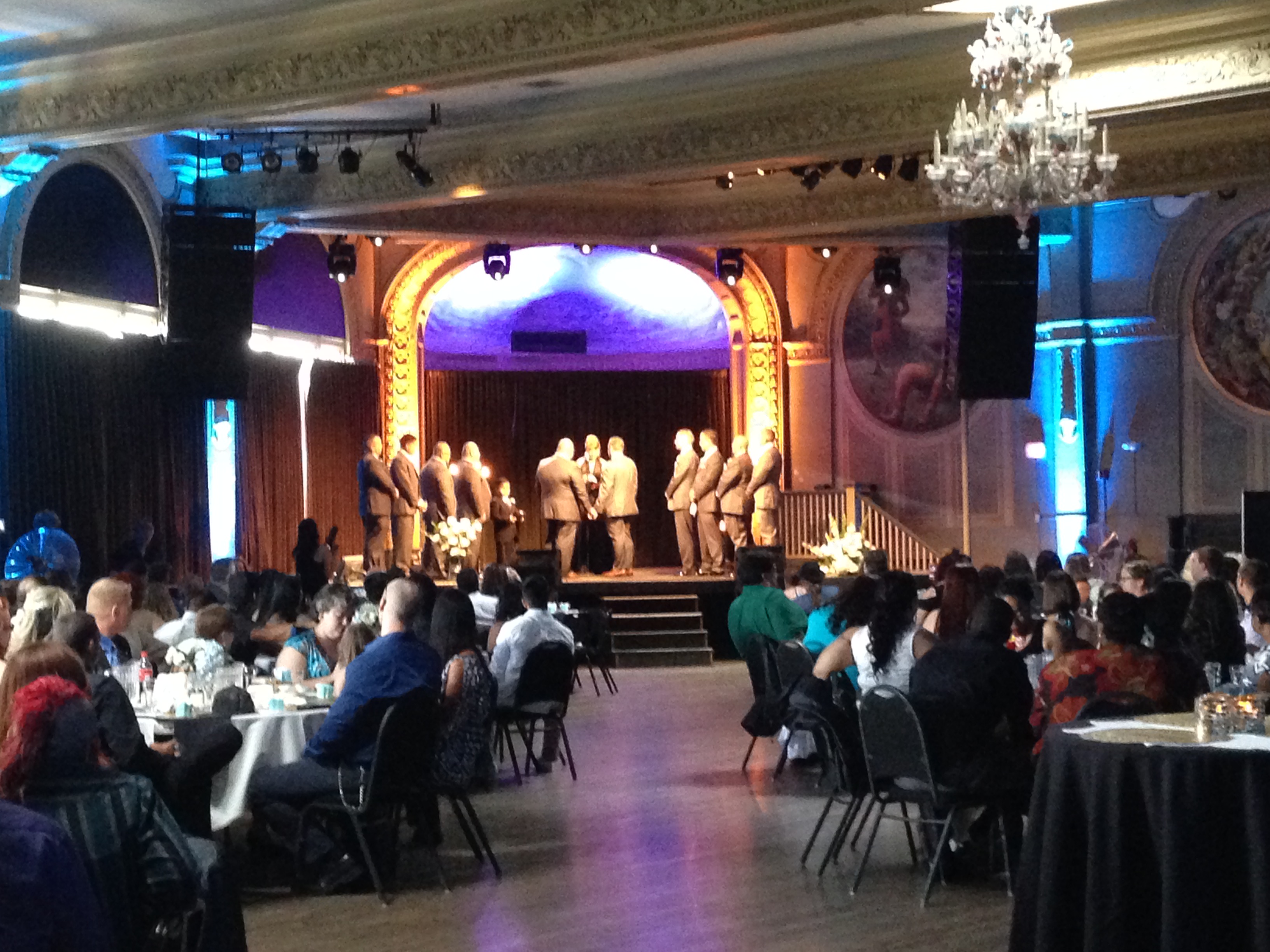 The wedding was held at the Crystal Ballroom in Portland. I’d never been there, and the art on the walls was gorgeous. Their theme of turquoise/gold was everywhere but not in a tacky way. It was fairly crowded and there wasn’t much room to move around. 8/10.