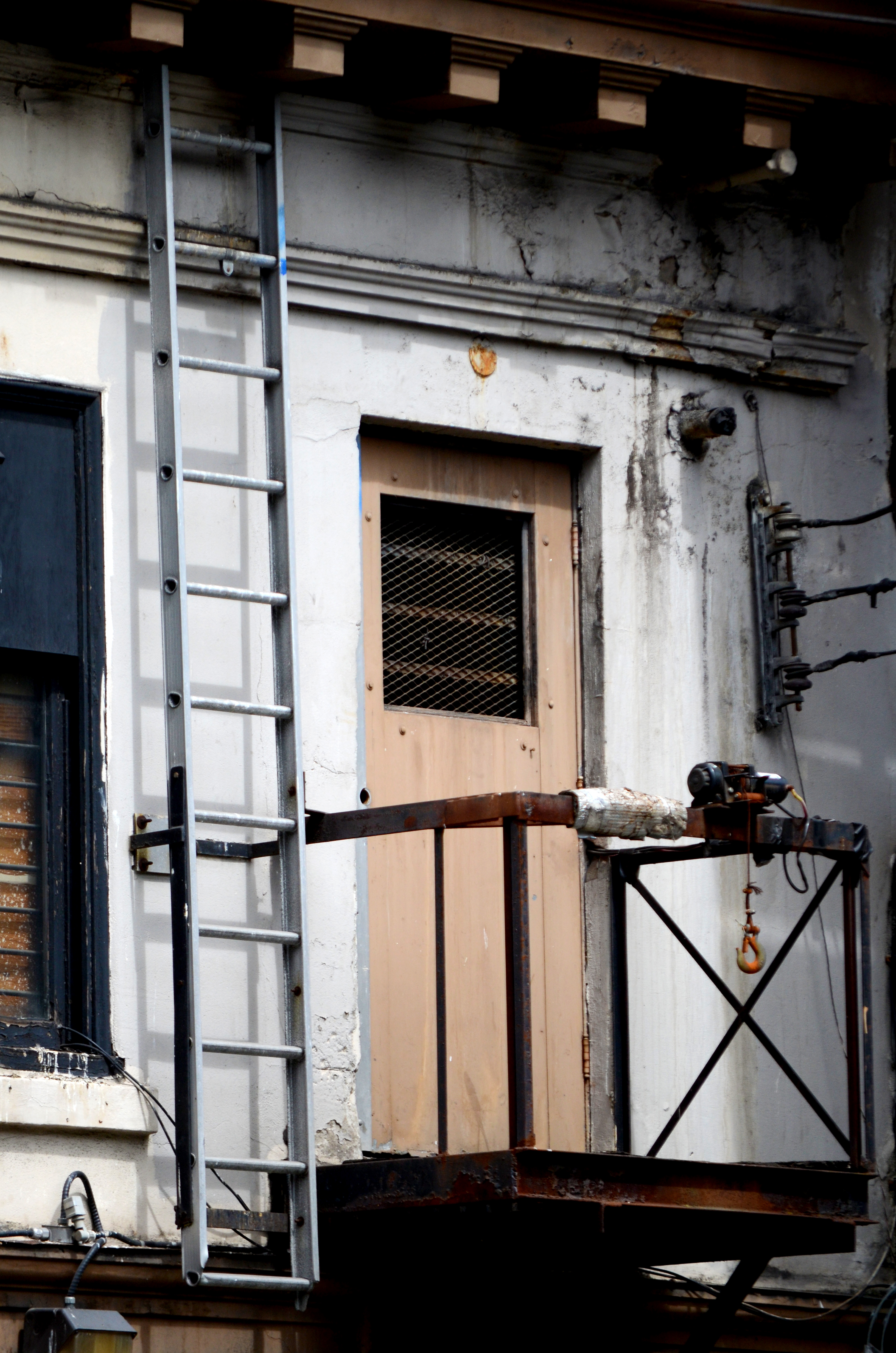 This is a mind bending photo. I’m wondering if the ladder was part of a fire escape, maybe the balcony was too. It looks like a winch attached to the balcony. I would worry about lifting something too heavy and pulling the whole thing down. I like this photo a lot.